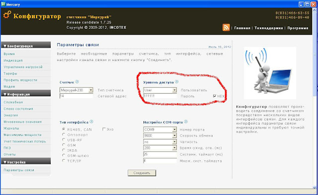 Если вы собираетесь просто читать данные со счетчика, то вам должно хватить уровня User , а уж если надо будет вносить изменения времени, тарифов или других конфигурационных регистров, то вам понадобится уровень Admin .