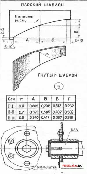 Сперва сделайте разаертку крыльчатки. Размеры этой развертки приведены на рисунке 3. Здесь цифры обозначают не миллиметры, а долн радиуса лопаткн рабочего колеса. Чтобы получить размеры в миллиметрах, указанные цифры умножьте на выбранный раднус рабочего колеса вентилятора. Затем лопаткам крыльчатки придайте нужный профиль — выколотите их на болванке. Болванку сделайте нз твердых пород дерева по размерам, указанным на рнсуике 4. Здесь размеры также даются в долях радиуса крыльчатки.