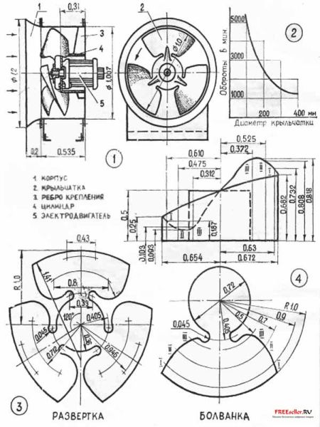 Если у вас есть электродвигатель и вы знаете его максимальное число оборотов, то по графику (рис. 2) вам нетрудно определить, какого максимального диаметра вы можете сделать вентилятор.